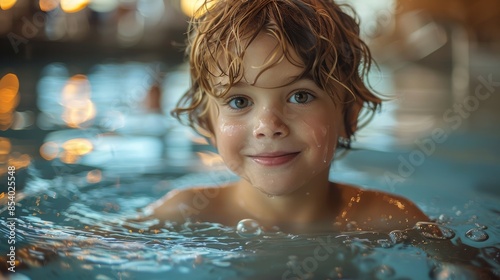 A cheerful boy with wet blonde hair and blue eyes smiles while immersed in pool water, with a blurred background