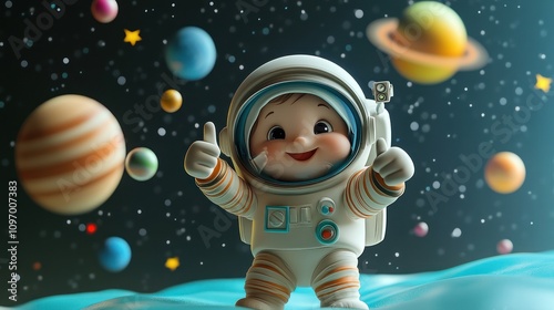 A cheerful cartoon astronaut gives a thumbs up in space surrounded by colorful planets.
