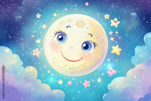 A cheerful, cartoonish moon with a smiling face surrounded by colorful stars and soft clouds in a dreamy night sky.