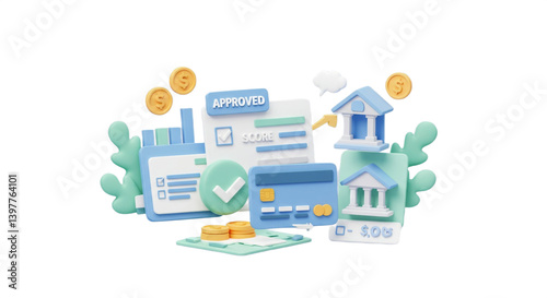 A cheerful celebration of financial approval, showcasing a credit card application, bank buildings, and coins, all rendered in a charming 3D style with pastel colors.