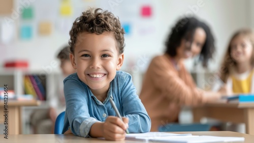 A cheerful child smiles at the camera while engaged in classroom activities, surrounded by peers and a teacher.