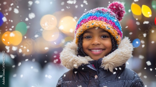 A cheerful child stands in a snowy urban setting, wearing a colorful hat and a warm coat. Flurries surround the smiling face, capturing the essence of winter joy and holiday spirit.