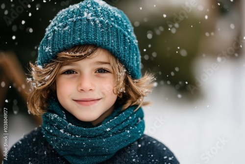 A cheerful child with a bright smile dressed in a cozy blue knit hat and scarf, enjoying a snowy day outdoors, surrounded by softly falling snowflakes.