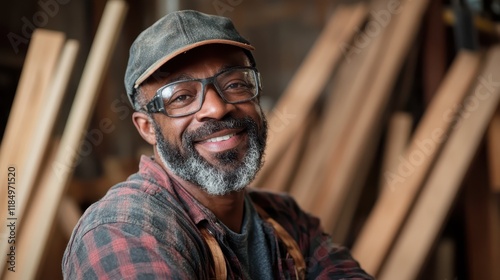 A cheerful craftsman with glasses shows off a bright smile in his woodshop filled with logs and planks, representing hard work and the satisfaction of creating with wood.