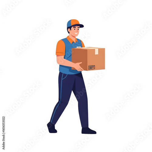 A cheerful delivery man in a blue and orange uniform walks while carrying a cardboard package.
