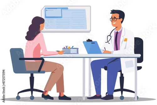 A cheerful doctor sitting at their desk, talking to a patient seated across from them. The doctor has a friendly expression and is holding a pen and a notepad.