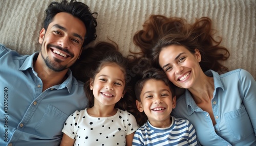 A cheerful family of four, including a father, mother, and two children, are lying on a soft carpet, radiating happiness. Their bright smiles and playful expressions create a warm atmosphere of love