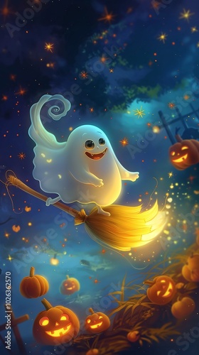 A cheerful ghost riding a glowing broomstick with tiny pumpkins and twinkling stars in the background of a magical night sky.
