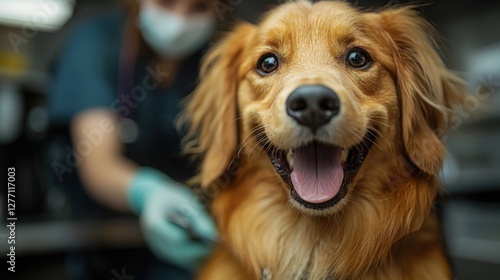 A cheerful golden retriever at a veterinary clinic, showcasing its playful personality. A veterinary professional can be seen carefully attending to the dog.