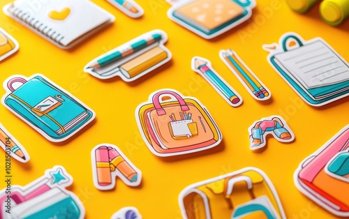 A cheerful icon set of school bag stickers, showcasing an assortment of fun designs such as notebooks, crayons, backpacks