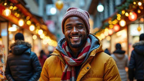 A cheerful man wearing a warm yellow coat and scarf, smiling in a vibrant market setting.