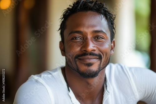 A cheerful man with curly hair and a confident expression sits comfortably, showcasing his friendly demeanor. The warm indoor lighting enhances the inviting atmosphere, making it a moment of genuine c