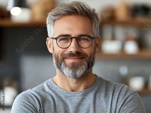 A cheerful man with glasses and a beard stands confidently in a contemporary kitchen, radiating positivity
