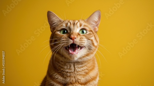 A cheerful orange cat with expressive green eyes against a yellow backdrop.