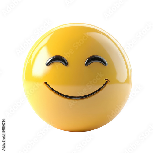 A cheerful smiley face emoji with a glossy yellow surface, perfect for conveying happiness and positivity in various designs., isolated on a transparent background.