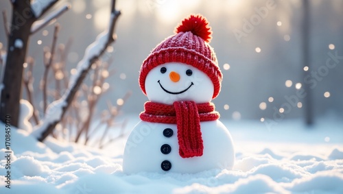 A cheerful snowman wears a red knit hat and scarf, standing in a snowy landscape with soft light.