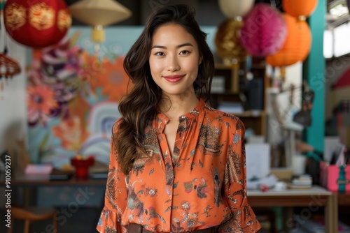 A cheerful woman smiling in an office setting decorated with vibrant paper lanterns, blending modern professional workspace ambiance with festive joy and bright, colorful aesthetics.