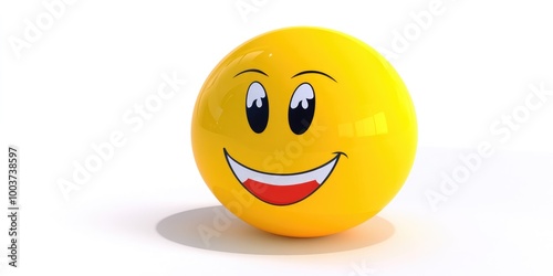 A cheerful yellow smiley face with bright eyes and a wide grin sitting on a white surface, radiating joy in a bright, sunny environment