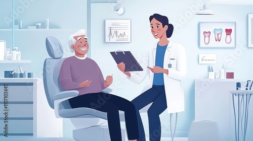 A cheerful young dentist with a clipboard, talking to an elderly patient in the dental chair, providing personalized and compassionate care.