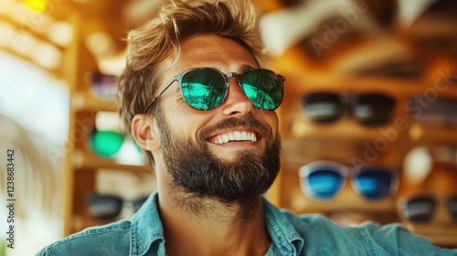A cheerful young man with a stylish beard wears sunglasses, smiling amidst an array of colorful eyewear on display, exuding confidence and summer vibes.