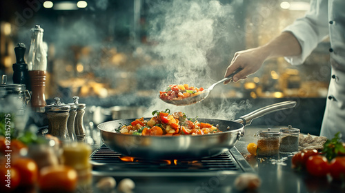 A chef in a crisp white jacket and hat skillfully preparing fresh vegetables, steam rising dramatically from the pan, creating a warm, professional kitchen ambiance with rich textures & vibrant color