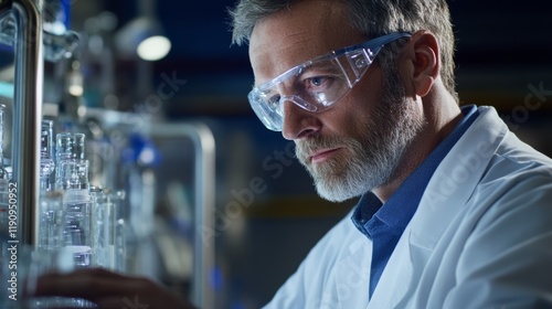 A chemical engineer in a lab coat and safety glasses analyzing samples in a high-tech chemical plant control room, Chemical plant control room scene, Analytical and controlled style
