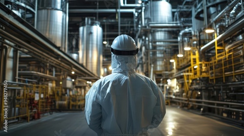 A chemical plant technician in full protective gear, monitoring reactions in massive tanks and reactors, with safety signs and pipes all around
