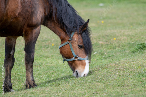 A chestnut brown horse standing and grazing in a green grassy field. The large muscular animal has white hoofs, long black mane and tail. The field has small yellow flowers, shrubs and a wooden fence.