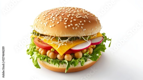 A chickpea burger on a sesame bun with lettuce, chickpeas, guacamole, shredded cheddar cheese, tomatoes, radish, and sprouts close-cut on a white background