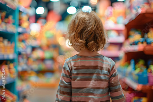 A child browsing through colorful toys in a store, filled with excitement and happiness. Suitable for family and leisure-related content.