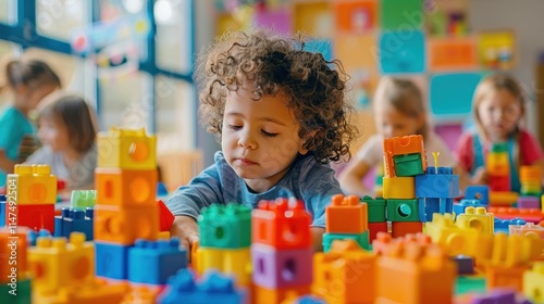 A child engages in creative play with colorful building blocks in a vibrant classroom setting.