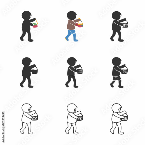 A child happily carrying a picnic basket full of goodies, ready for a fun outdoor adventure, depicted in various simple line art styles.