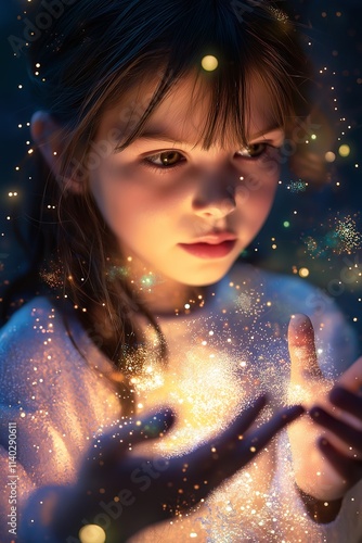 A child observes glowing sparkles surrounding her hands, reflecting purity, innocence, and wonder.