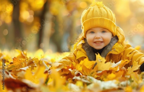 A child with a radiant smile playing with autumn leaves in a park, golden foliage all around