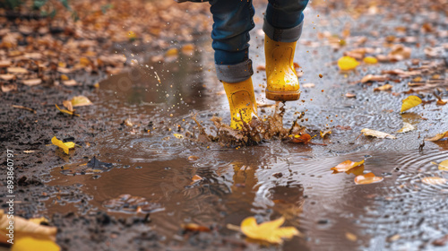 A child's bright yellow rain boots splashing in a muddy puddle on a rainy autumn day, wet weather adventure concept