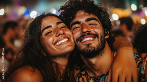 A Chilean couple in a concert crowd, looking directly at the camera with happy expressions, surrounded by the energy of the audience