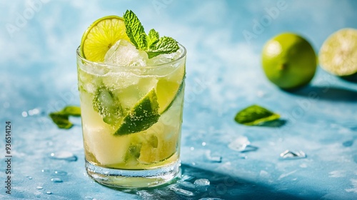 A chilled Caipiroska with fresh lime and mint, set against a clean, crisp blue backdrop for a modern look