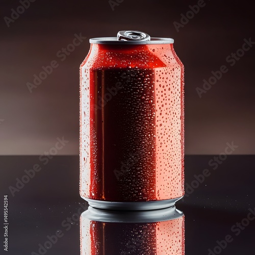 A chilled red soda can with condensation sits on a reflective dark surface, showcasing elegant design and refreshing beverage appeal; perfect for advertising or editorial use.
