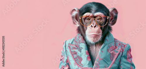 A chimpanzee wearing stylish glasses and a floral jacket against a pink background. The whimsical image blends elements of humor and fashion.