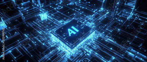 A chip with the letters "AI" on it, surrounded by circuit lines and glowing blue light effects Generative AI