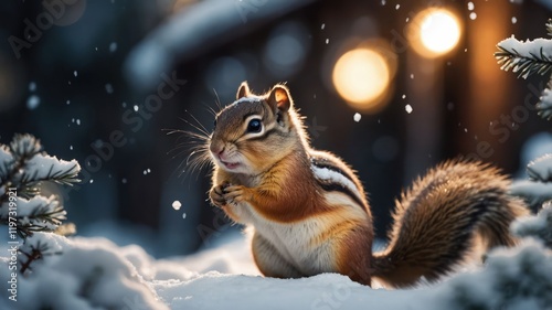 A chipmunk in the snow, surrounded by trees, enjoying a serene winter moment.
