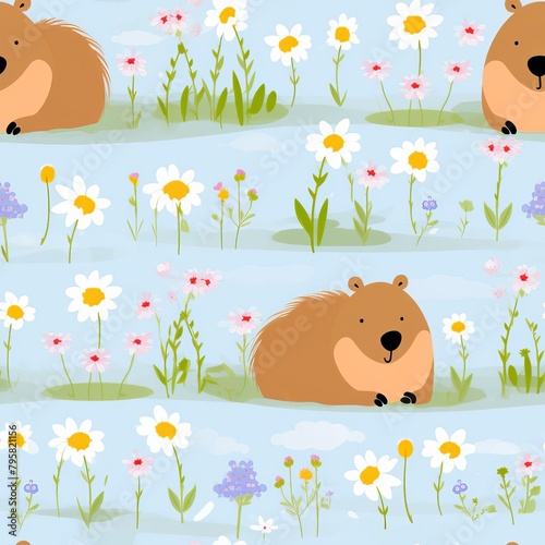 A chonky Capybara napping peacefully in a field of wildflowers, butterflies fluttering around, seamless background,