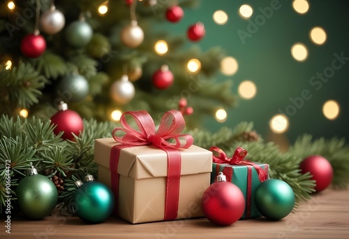 A Christmas scene with ornaments, a gift box, and pine branches on a green background with bokeh lights
