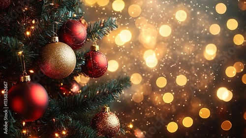 A Christmas tree adorned with golden bokeh lights and red and gold ornaments.