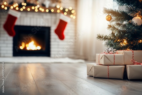 A Christmas tree sits in front of a fireplace with red stockings on the mantle