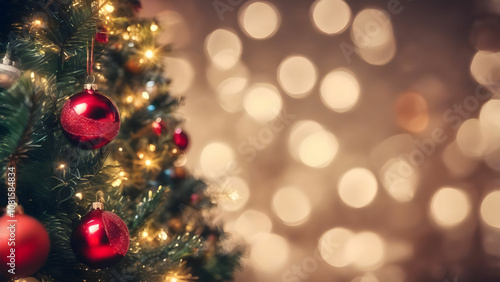 A Christmas Tree With Baubles And Blurred Shiny Lights