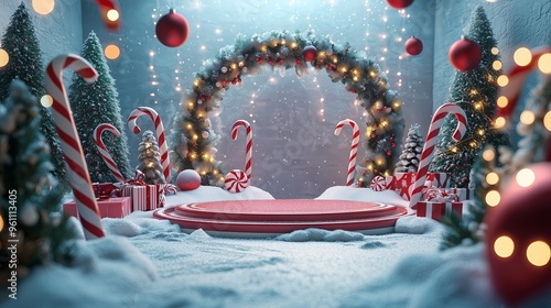 A Christmas-themed stage with a large wreath, candy canes, and snow-covered trees, surrounded by festive lights and decorations.