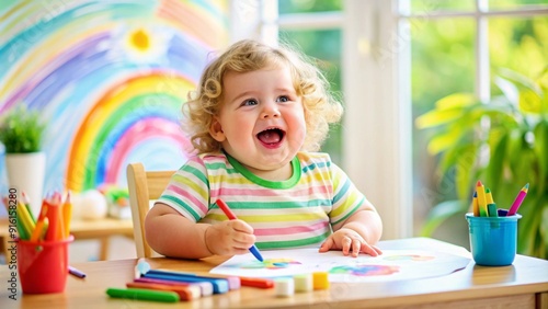 A chubby-cheeked toddler, with a gleeful expression, is engrossed in creating a masterpiece. The toddler’s face and clothes are splattered with vibrant paint, and the table is overflowing with art
