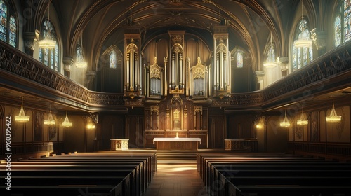 A church interior with a beautiful pipe organ, ornate altar, and rows of empty pews.