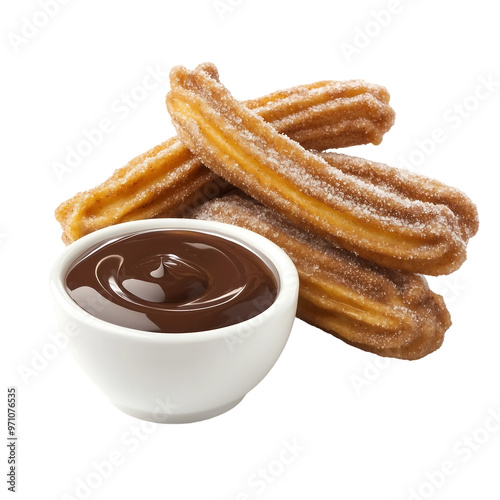 a churro, dusted with cinnamon sugar and served with a side of chocolate dipping sauce. Isolated on white background